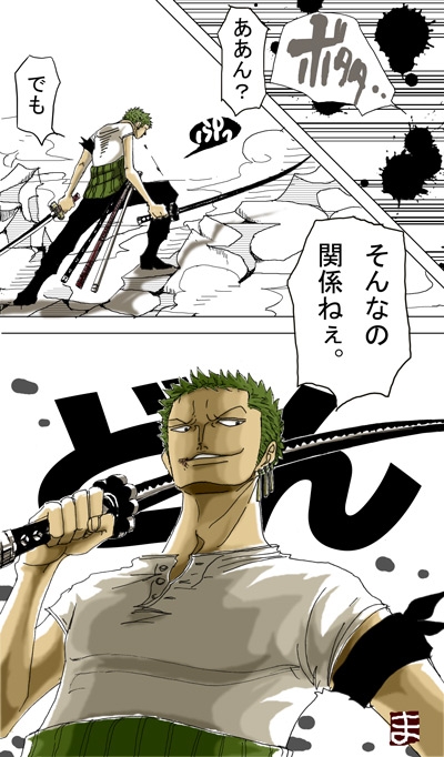 悪ノリゾロ?!悪ノリゾロ様だっ!! ぷって血糊吐く背中がものっそ男前です! あああ、好き〜〜〜〜〜っ(うるさい) 広い胸板尊大な態度 どこまで俺様〜〜〜〜〜!! 「でも」とか言わないなんて言わない(笑) 「でも」もアリだ、このゾロ様ならvv そんなの関係ねえんだ、ねえねえっ そんなのカンケーねーは 普通に聞いてるとムカつくんですけど(笑) ゾロが言うと意味が違う!! 関係ねえよ、全然問題ナッスング!! 新境地、悪ノリゾロ様、ありがとうございますvv