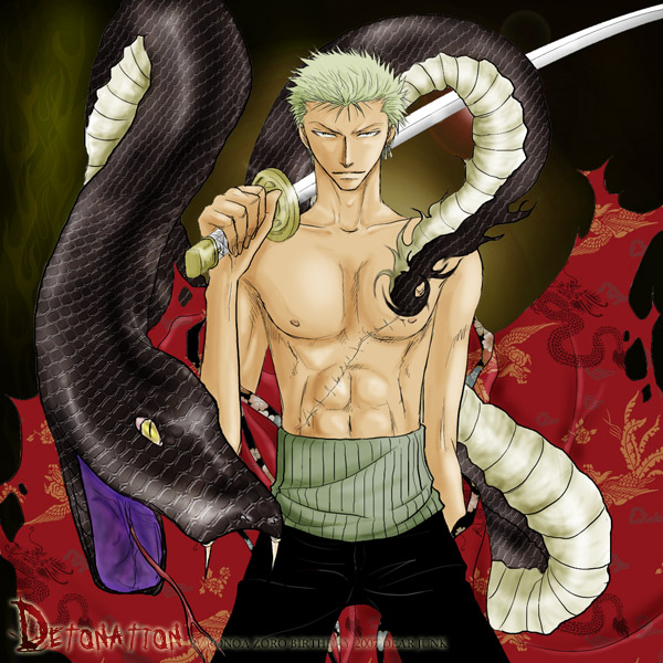 繭子さんちで、太っ腹DLFになっていたので、 勝手にいただいてまいりました!! だってこれは・・・かはっ(吐血) いやもう、素晴らしいの一言に尽きるでしょう。 爬虫類、嫌いじゃないのでなお更ツボ入り。 鋭利なゾロの表情が、何故か影よりも光を感じさせて こちらが魅入られてしまいそうです。 繭子さん、素晴らしいイラストありがとうございました〜v (届かないお礼。なぜなら無断でもらってきたから:笑)