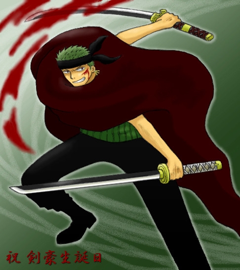 大剣豪さまあああああああああっ!!! と、思わず叫びたくなるような剣豪さまです!! 飛び散る血潮も鮮やかな、躍動感溢れる悪ゾロ様!! 不敵に笑う目つきと口元が素敵vv ゾロはこうして、戦っている時が一番 生き生きと輝いているんでしょうね。 色んな業を背負いつつ、 雄々しく気高く生きる剣士!! やまねこ様vうっかり妄想走りそうな 素敵悪ゾロ様!ありがとうございますv