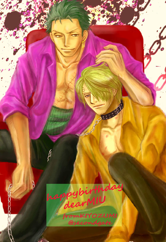 サン誕飼育、ちゃんと続けられるかどうか未定と 弱音を吐いたら、キヨズミさんが美味しい人参を 目の前にぶら下げてくださいました! 【首輪サンジとゾロ】 わーわーわー!おねだりしてよかった(貴様) とんでもないプレゼントです。 サンジったらv愛された痕も生々しく これ見よがしなゾロが素敵vこれはもう、私も頑張らねばなりません! だからサンジも、思い切りゾロに可愛がってもらってねーv ほんとにほんとにありがとうございます!