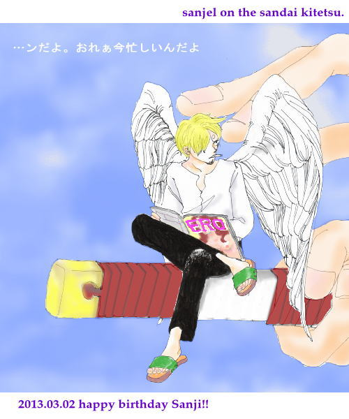 手乗りサンジェル、きたー!!(笑) きゃー、ちっこいのになんて可愛いらしくも豪奢な天使なんでしょう。 羽根が立派で、とても綺麗。 なのに不遜で、読んでる雑誌は「ERO」ですか!(ツボったww) ゾロの指が、なんとも言えずいいです。 弾いたり握りつぶしたりしようとはしない指先(多分:笑) そっと触れたり、するのかなあ。 ふと視線を下げたら鬼徹の鞘にこんなん乗ってたら驚きますよ。ぷぷぷ(^m^) 思いがけない小さなサンジェル様を、ありがとうございます!