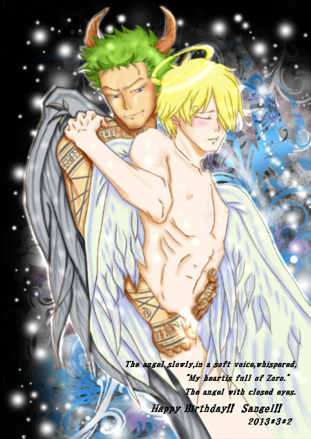 美しい天使ちゃんと悪魔キター!! ありがとうございます、いやそんな 散髪してないゾロとか(笑) そんなことないです、なんてワイルドで 魅力的な悪魔でしょう。 サンジェルちゃんが毒牙にっ!(ワクワク)←あ 英文がまた素敵です。 英語は(も)さっぱりなんで、もうただただ素敵〜〜v ゾロでいっぱいなサンジェルちゃん、ありがとうございます。