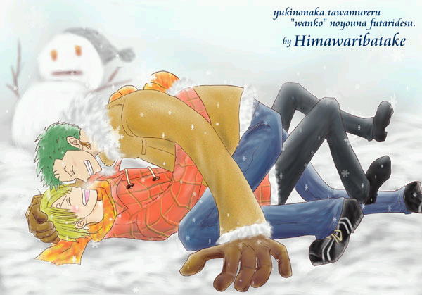 「ひまわり畑」のチョコミンさんから、 転げまわる子犬のような可愛い二人を いただいてきてしまいました! あああ、可愛い〜 ゾロの手がでっかくて、ぼはっとサンジを 包み込むみたいなのが、またいい〜vv 雪なんか全部解けちゃうくらい暖かくて、 ラブラブな二人がたまりませんっ チョコミン様、素敵イラストをDLFにしてくださって ありがとうございましたv